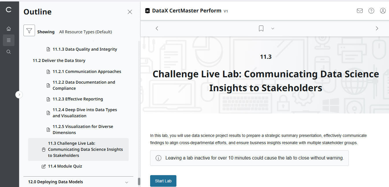 Master data science skills and prepare for real-world challenges with DataX CertMaster Perform. This comprehensive course combines instructional lessons, video, hands-on practice, and scenario-based exercises to help you apply your knowledge in practical environments. Aligned with DataX exam objectives, it’s designed to reinforce your skills and prepare you for the CompTIA DataX (V1) certification.